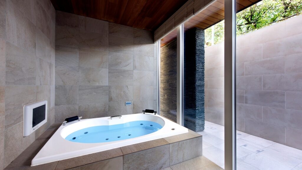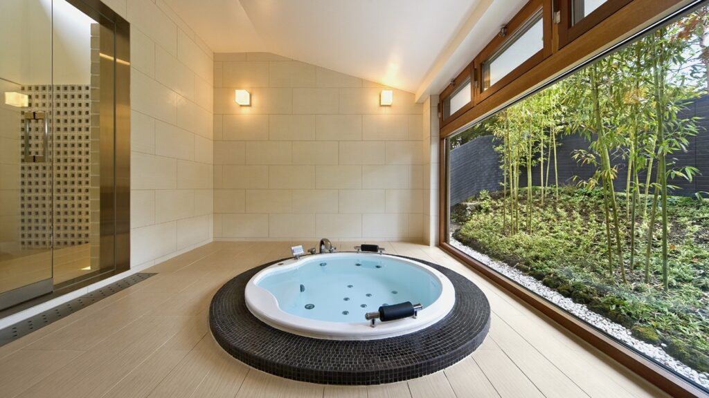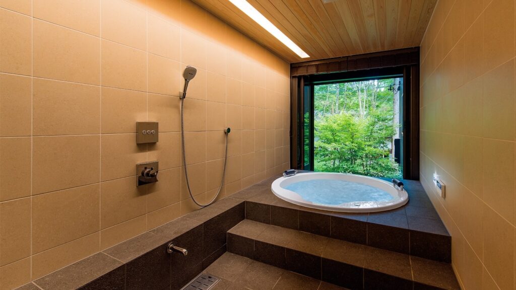 竹林を望む贅沢な景観が楽しめるバスルームです。床から天井まで広がる大きな窓が外の自然をそのまま取り込み、開放感と静寂が共存する空間を作り出しています。アルティスの丸型バスタブが洗練されたデザインで室内の優雅さを引き立て、モダンなタイルは全体に落ち着きと高級感を与えています。