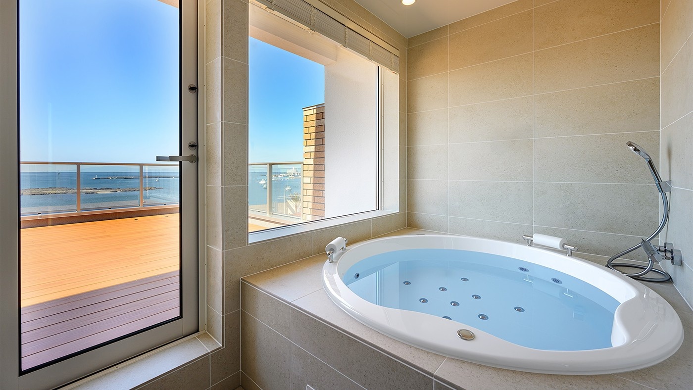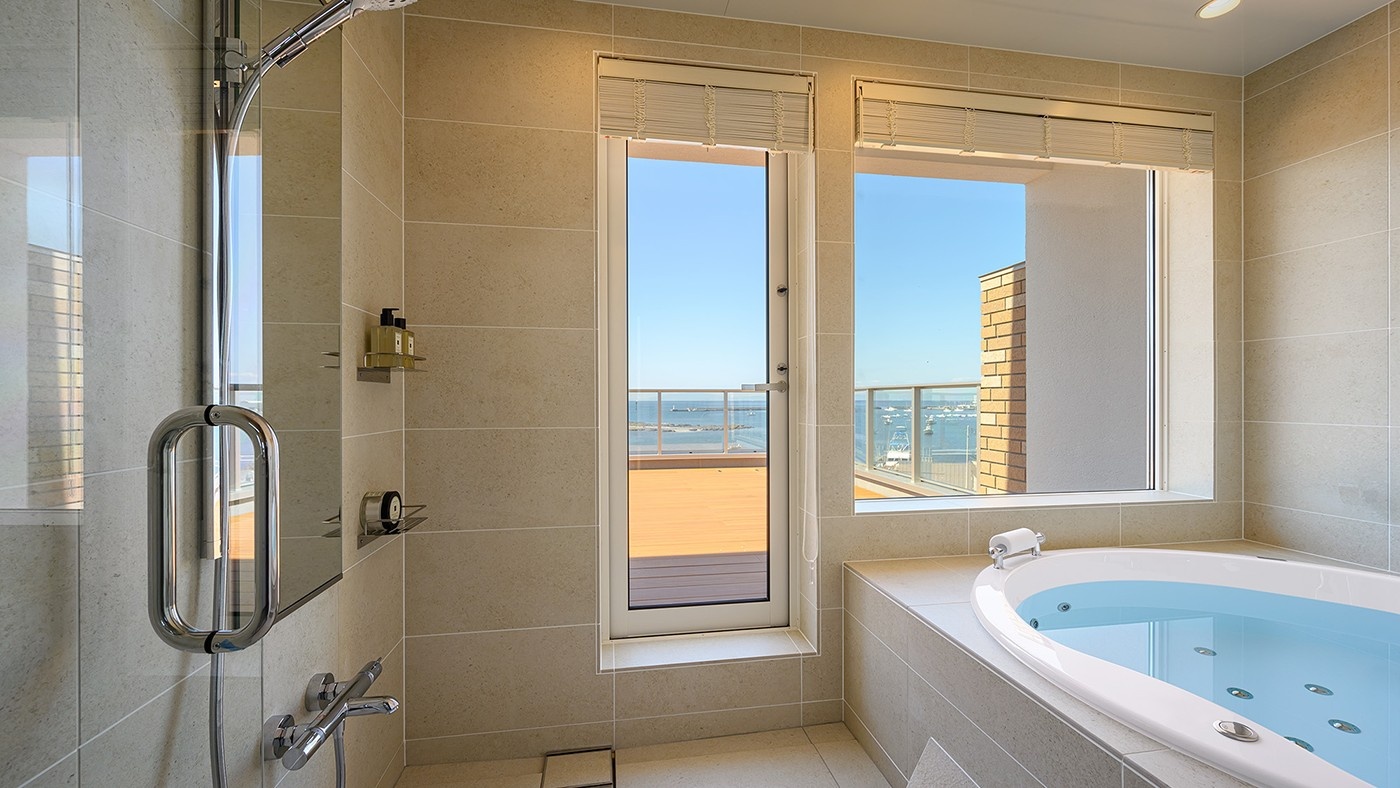 目の前に広がるのは、どこまでも続く穏やかな海と空。バルコニーへと繋がる大きな窓を開け放てば、バスルームは自然と一体となる特等席に変わります。潮風を感じながら浸かるジェットバスは、日常のすべてから心を解き放つ、最高に贅沢な体験。このロケーションのためだけにあつらえられたオーダーメイドのバスタブが、誰にも真似のできない、唯一無二の時間を演出します。